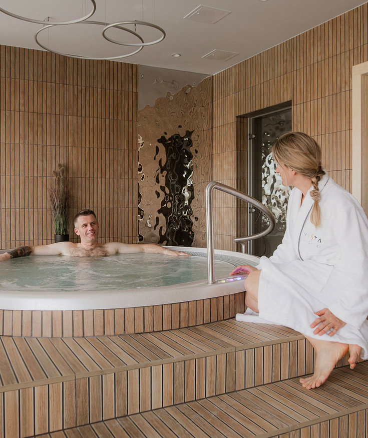 Sezonowy basen zewnętrzny sprzyja letniemu relaksowi z widokiem na naturę, a całodobowo dostępne jacuzzi i sauny otulają ciepłem i spokojem — niezależnie od pory dnia i roku.